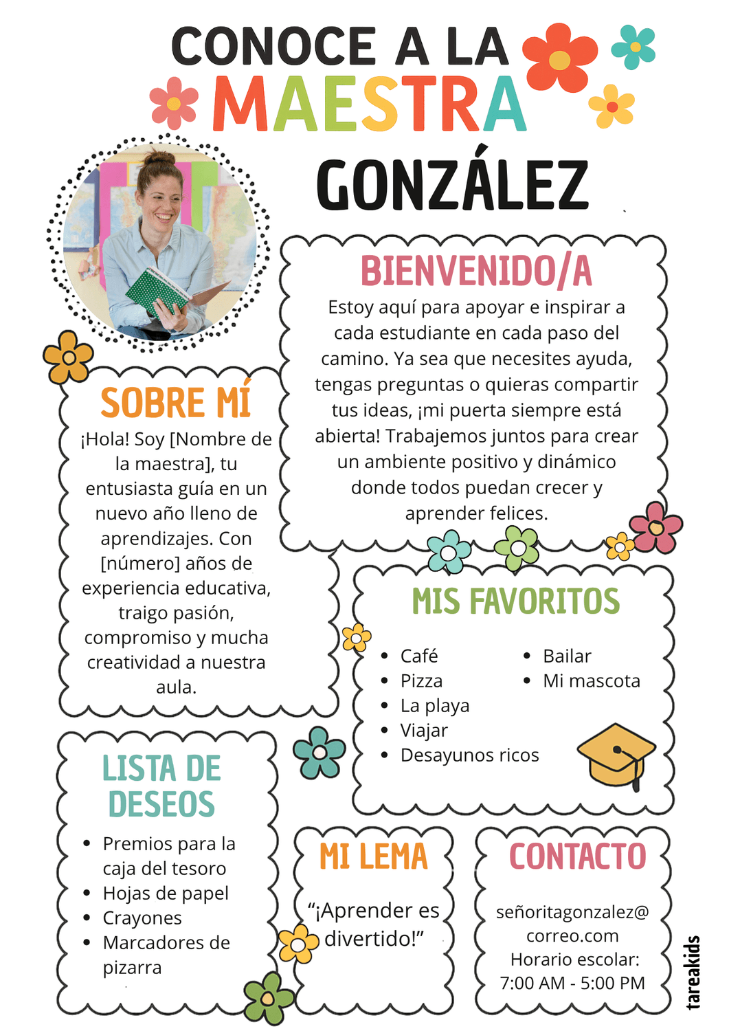 Todo esto decorado con un diseño infantil y profesional, con flores, tipografías llamativas y colores que reflejan entusiasmo y cercanía.
