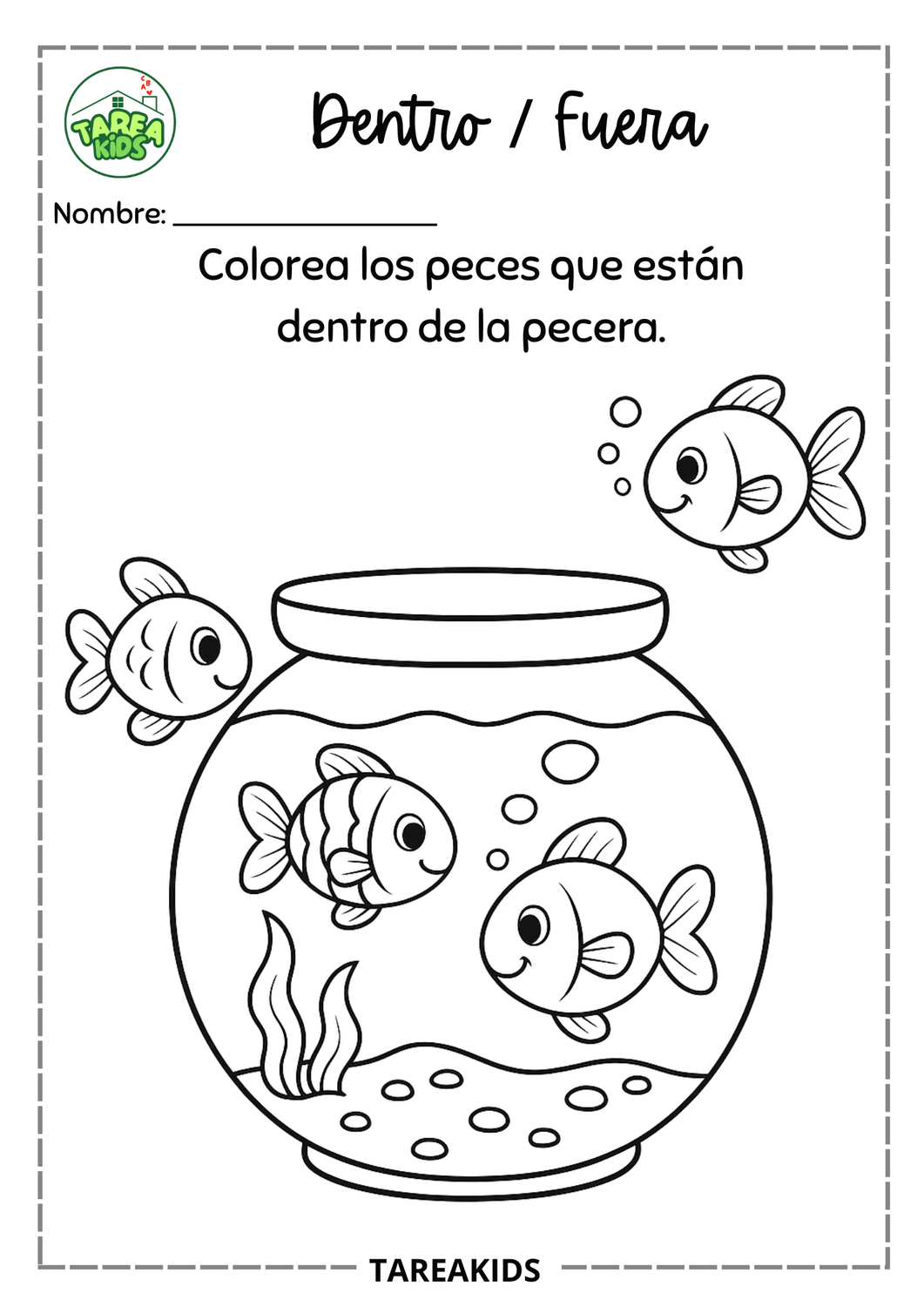 Colorea los peces que están dentro de la pecera. Los niños deberán identificar cuáles se encuentran en el interior y cuáles fuera de ella.