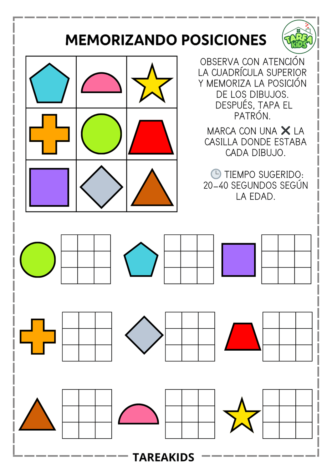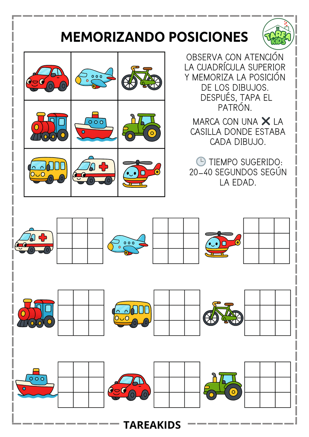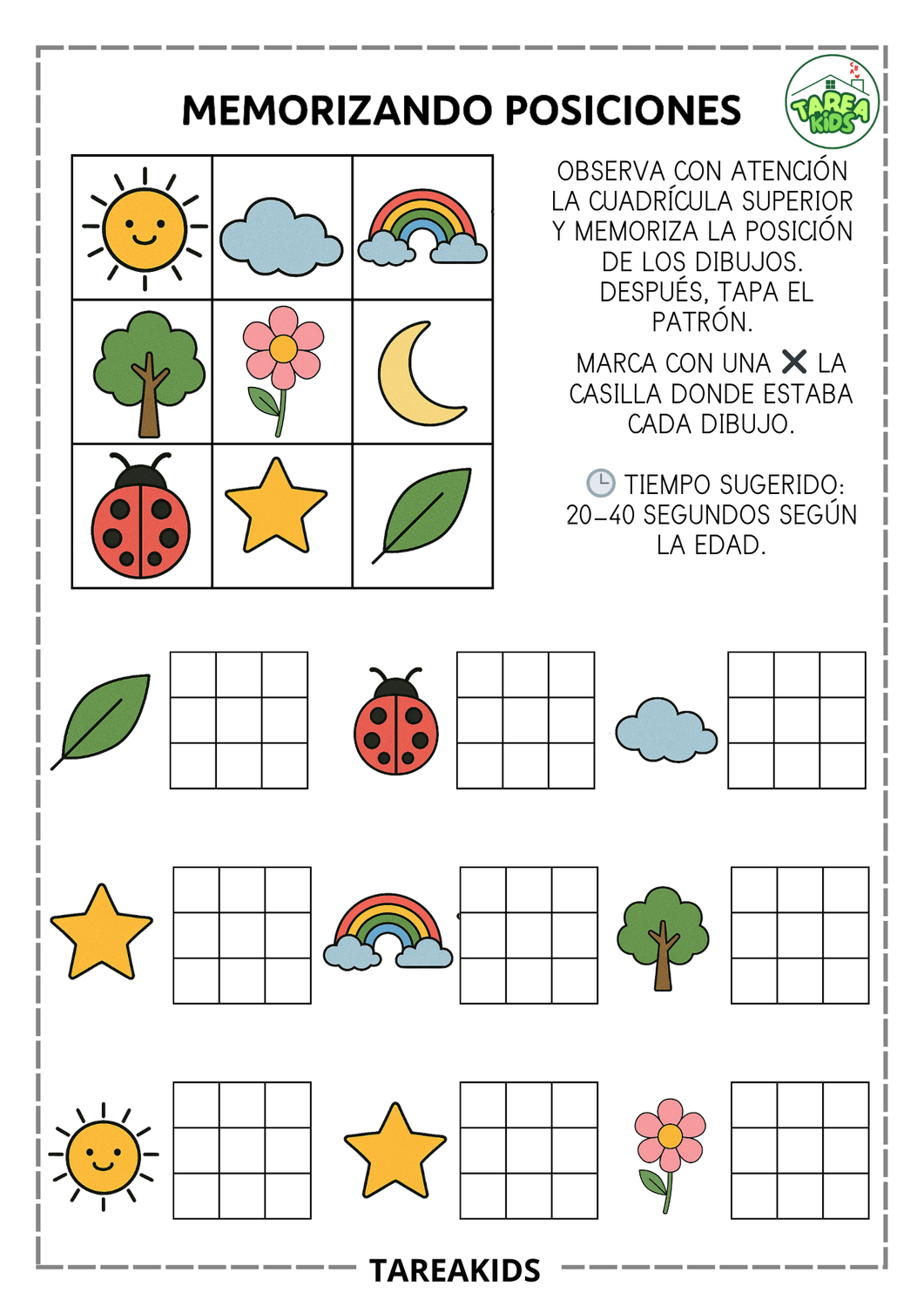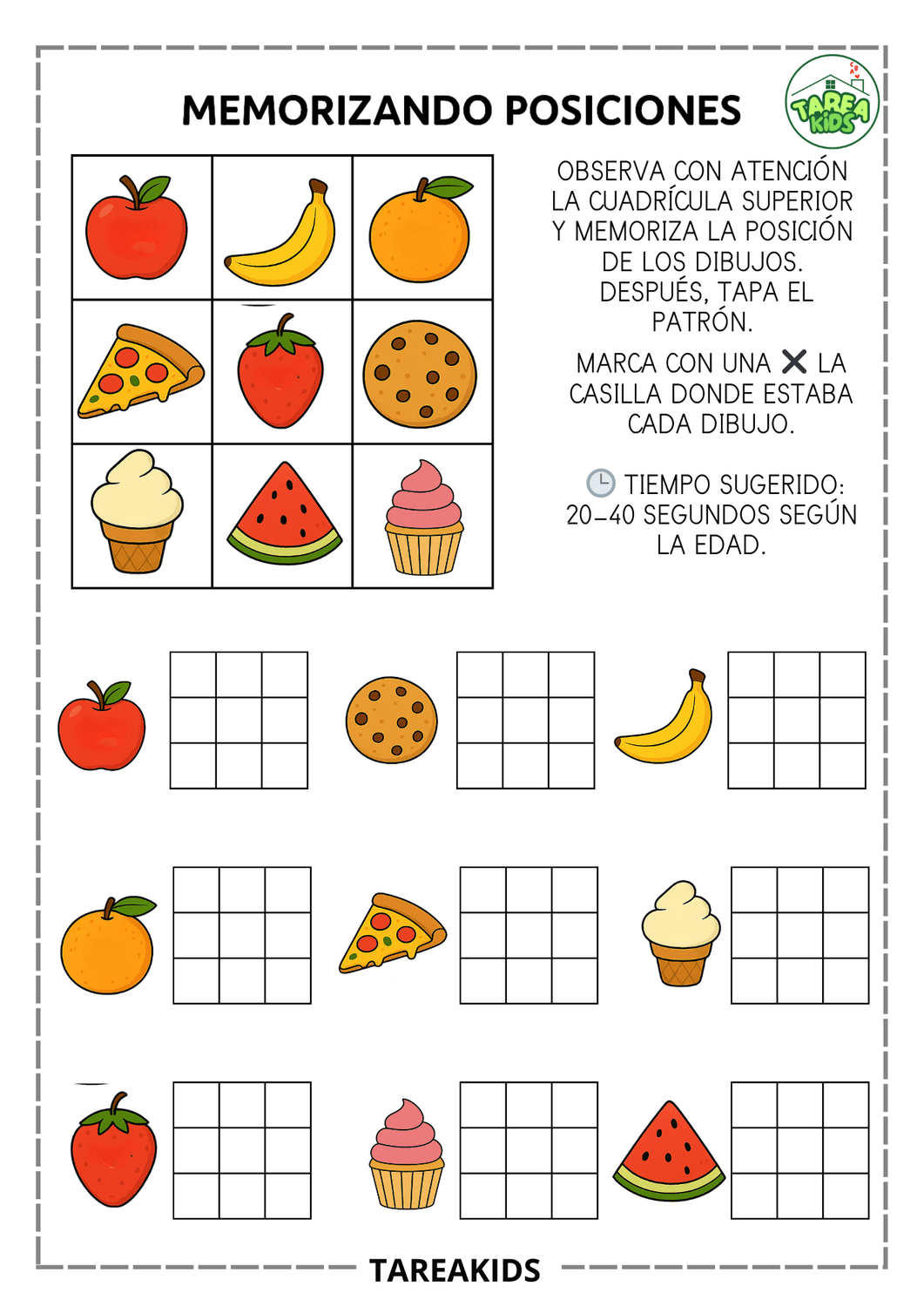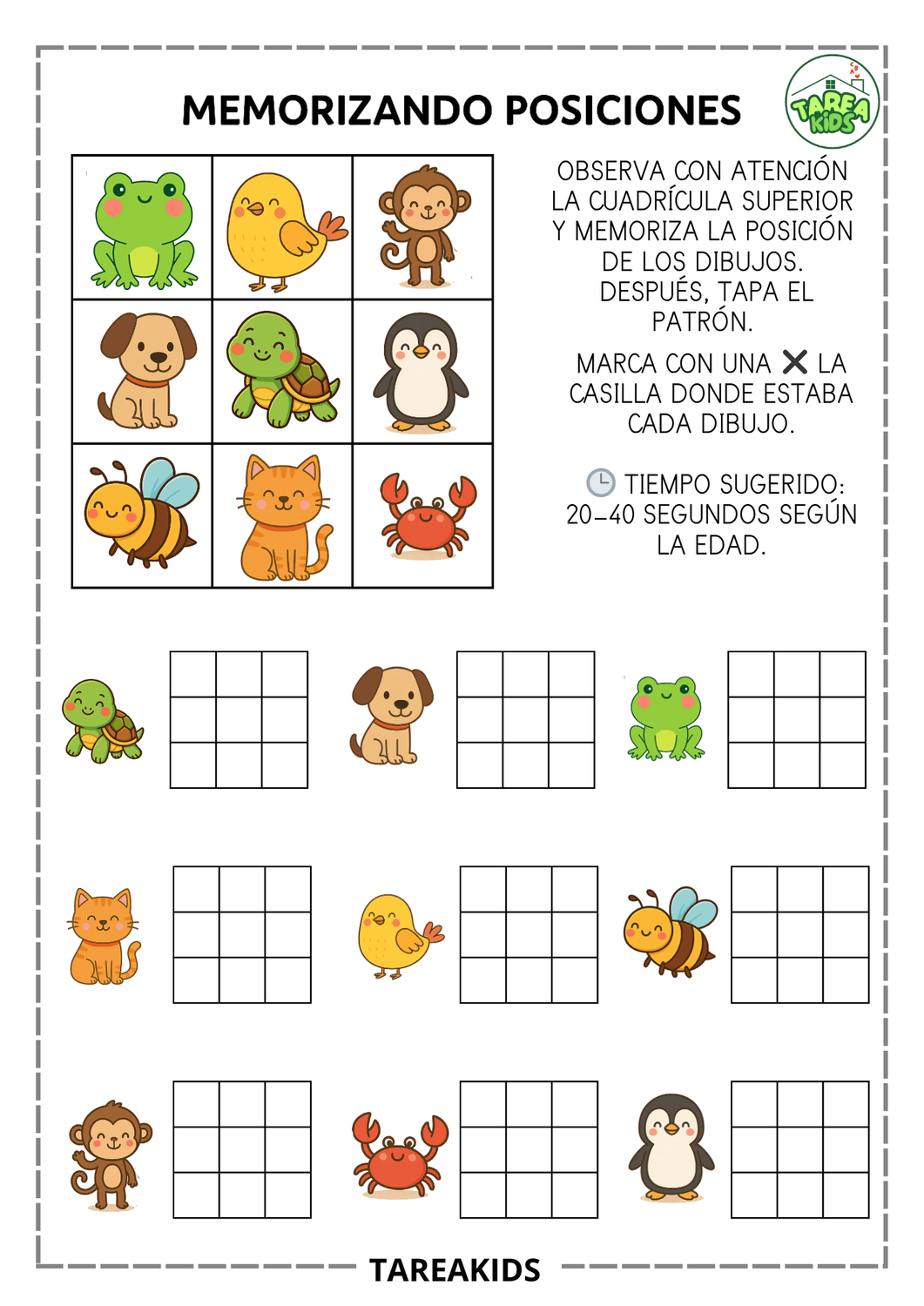 Las fichas que has visto en esta entrada trabajan exactamente estas habilidades. El niño observa una cuadrícula con imágenes (animales, objetos, formas), memoriza su posición durante unos segundos y luego marca dónde estaba cada elemento.