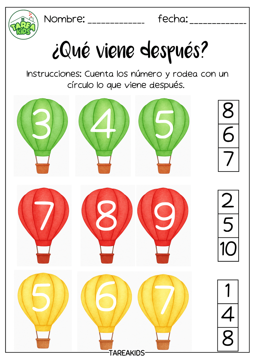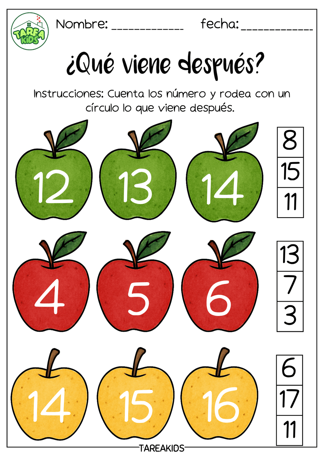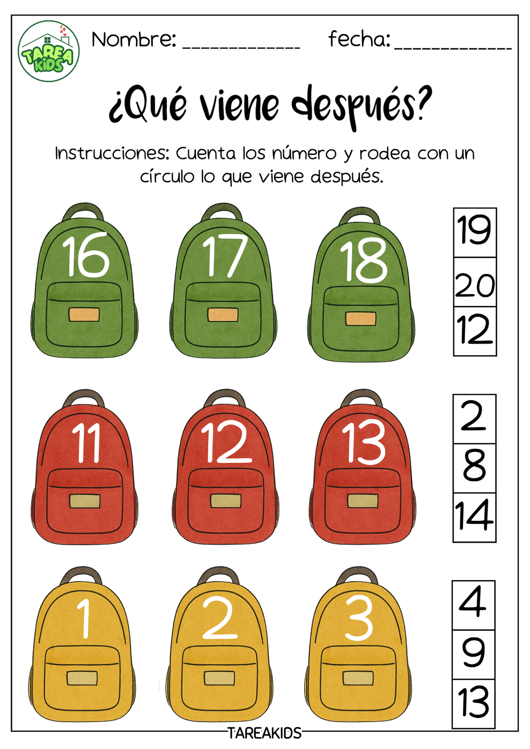¿Estás buscando actividades educativas divertidas y efectivas para que los niños aprendan los números en orden? En Tarea Kids hemos creado un set de fichas imprimibles totalmente gratis que ayudan a los más pequeños a reconocer qué número viene después dentro de una secuencia del 1 al 20. Ideal para preescolar, primer grado o educación en casa.