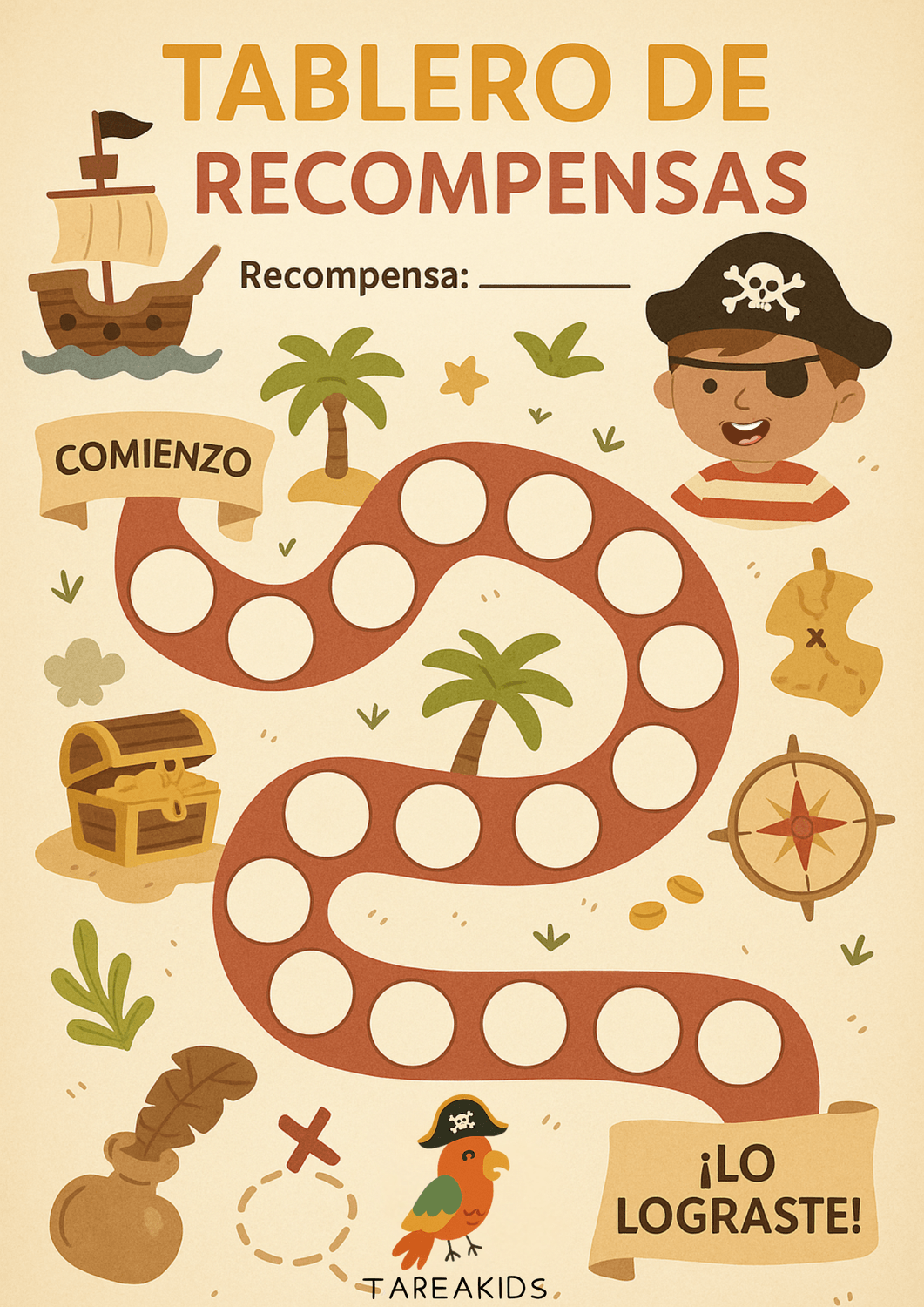 En Tarea Kids hemos diseñado un tablero de recompensas con temática de piratas para imprimir gratis, perfecto para acompañar las rutinas de los niños con motivación, constancia y mucha imaginación.