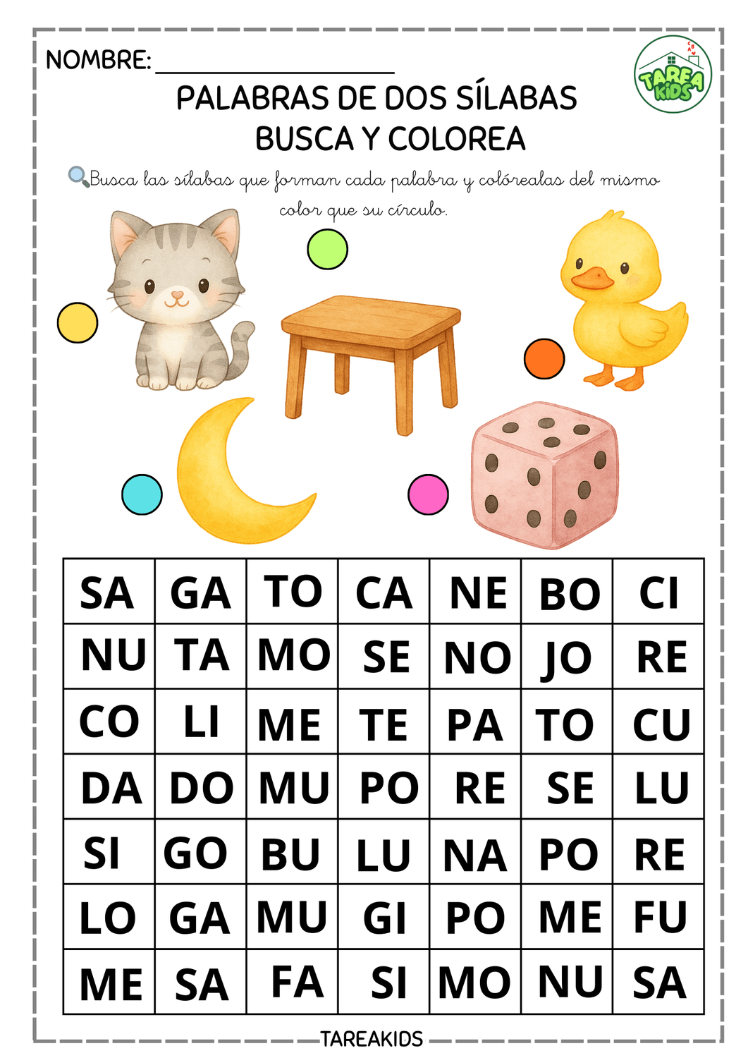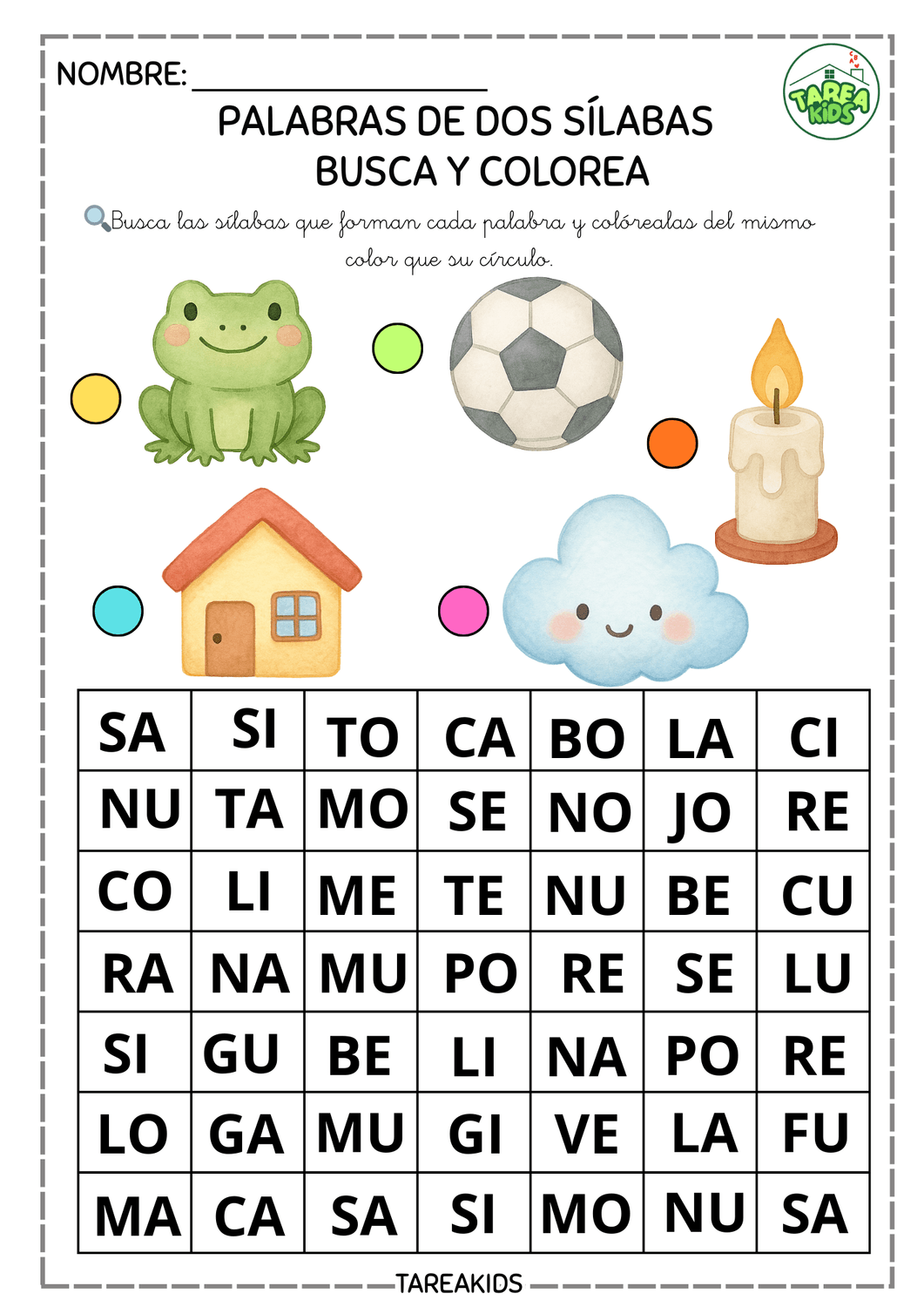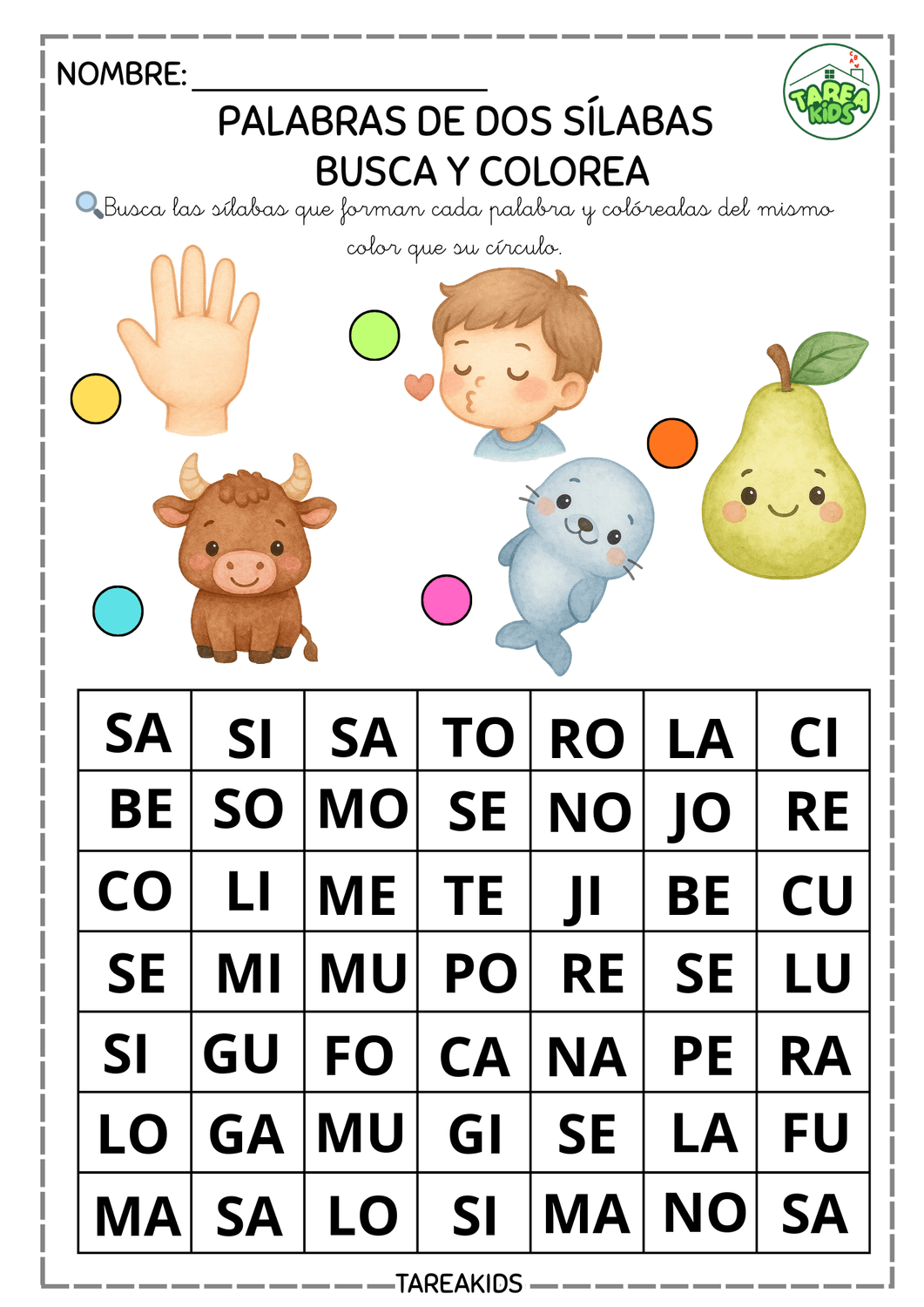 Las actividades de palabras de dos sílabas para niños son una herramienta fundamental en el proceso de alfabetización temprana. En Tarea Kids hemos creado estas fichas didácticas tipo "Busca y colorea" que combinan conciencia fonológica, lectura inicial y motricidad fina de una forma divertida, visual y muy atractiva para los más pequeños.