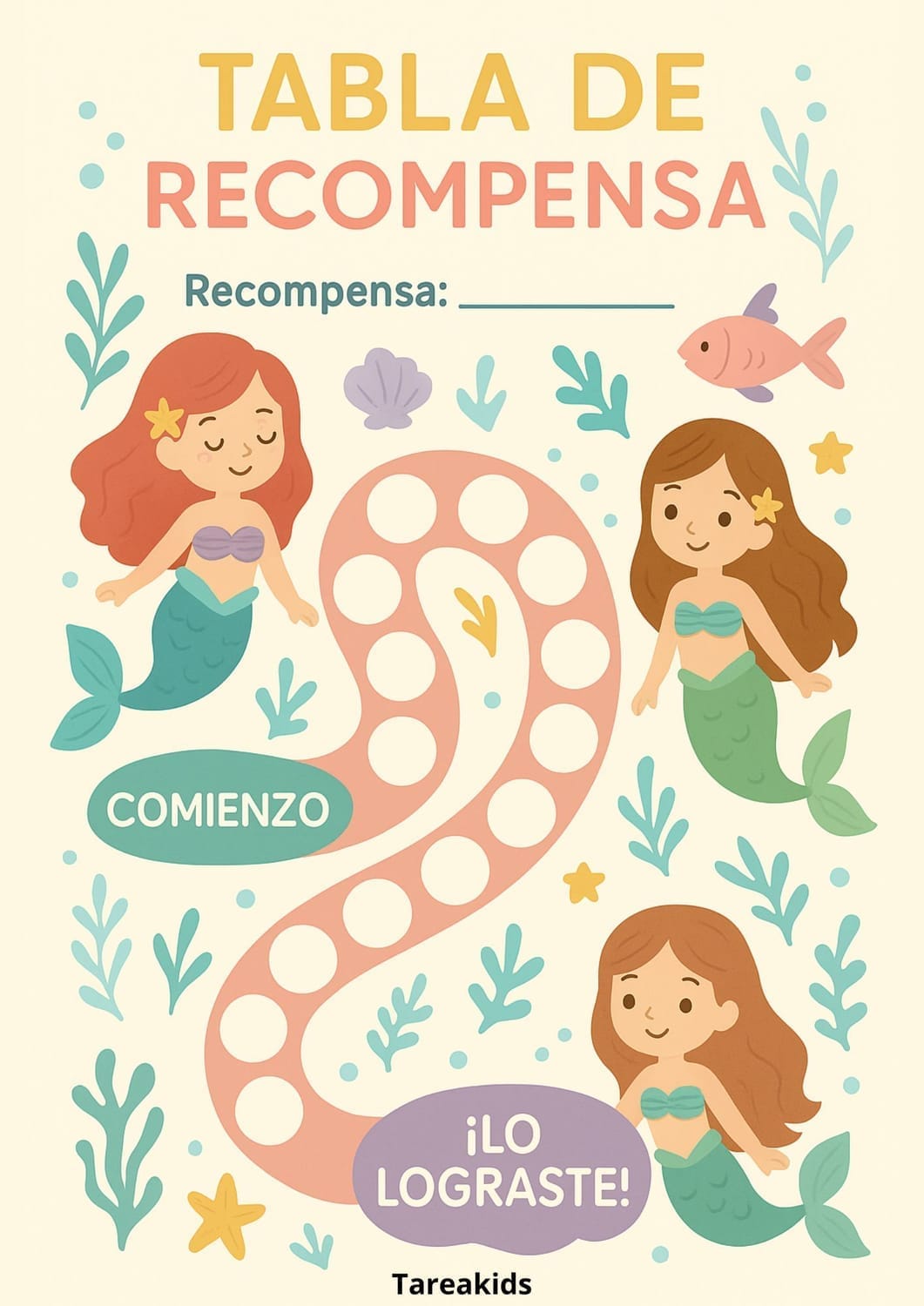 En Tarea Kids te ofrecemos recursos educativos imprimibles gratuitos para padres, madres y profesores que desean fomentar buenos hábitos de manera lúdica y visual. Hoy te traemos una de nuestras actividades favoritas: una tabla de recompensas gratuita en español con diseño de sirenas y elementos marinos para motivar a los más pequeños en sus rutinas diarias.