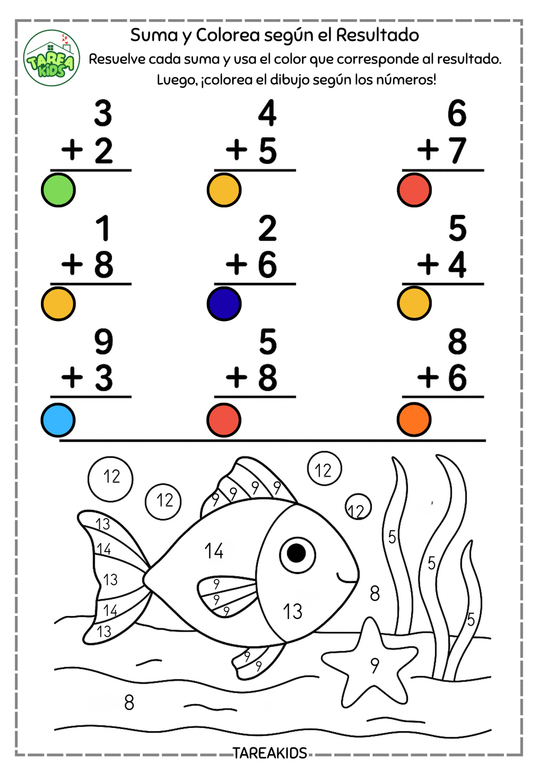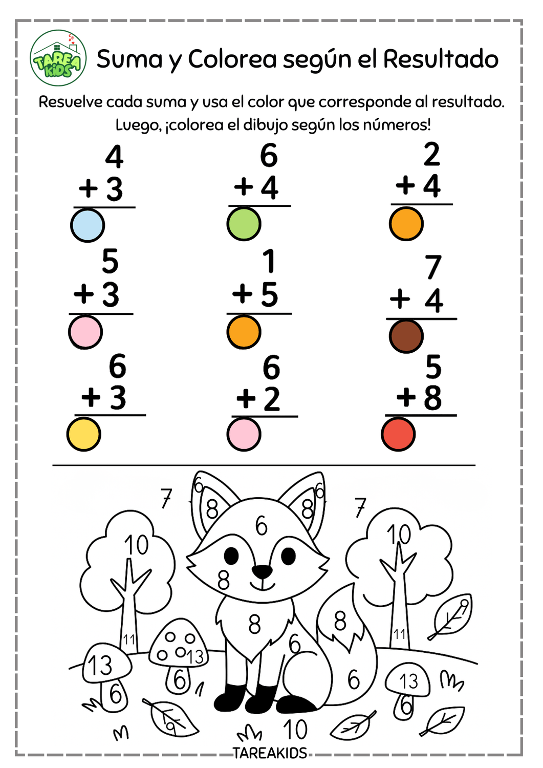 ¿Buscas una forma divertida y efectiva de enseñar matemáticas a los más pequeños? En Tarea Kids te ofrecemos actividades imprimibles gratuitas de “Suma y Colorea según el resultado”, una herramienta pedagógica que transforma las sumas en un juego lleno de colores, personajes adorables y mucho aprendizaje.